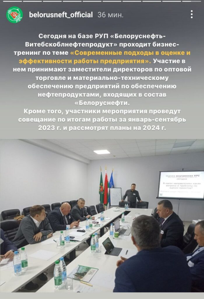 Место проведения: Витебск Заказчик: Белоруснефть Организатор: ACTIVE SALES Тренеры: Виталий Дубовик Участники: Руководители отделов, директора, управляющие предприятием