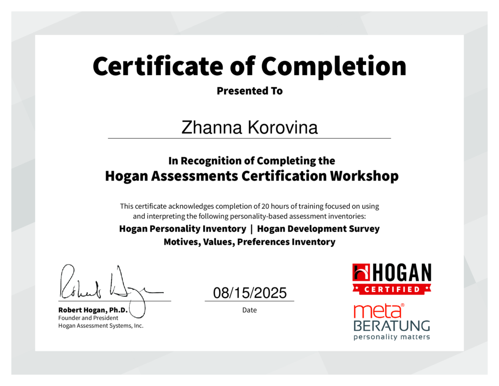 - Сертифицированный консультант и тренер по HOGAN Assessment, использует лучшие международные практики диагностики поведения и потенциала